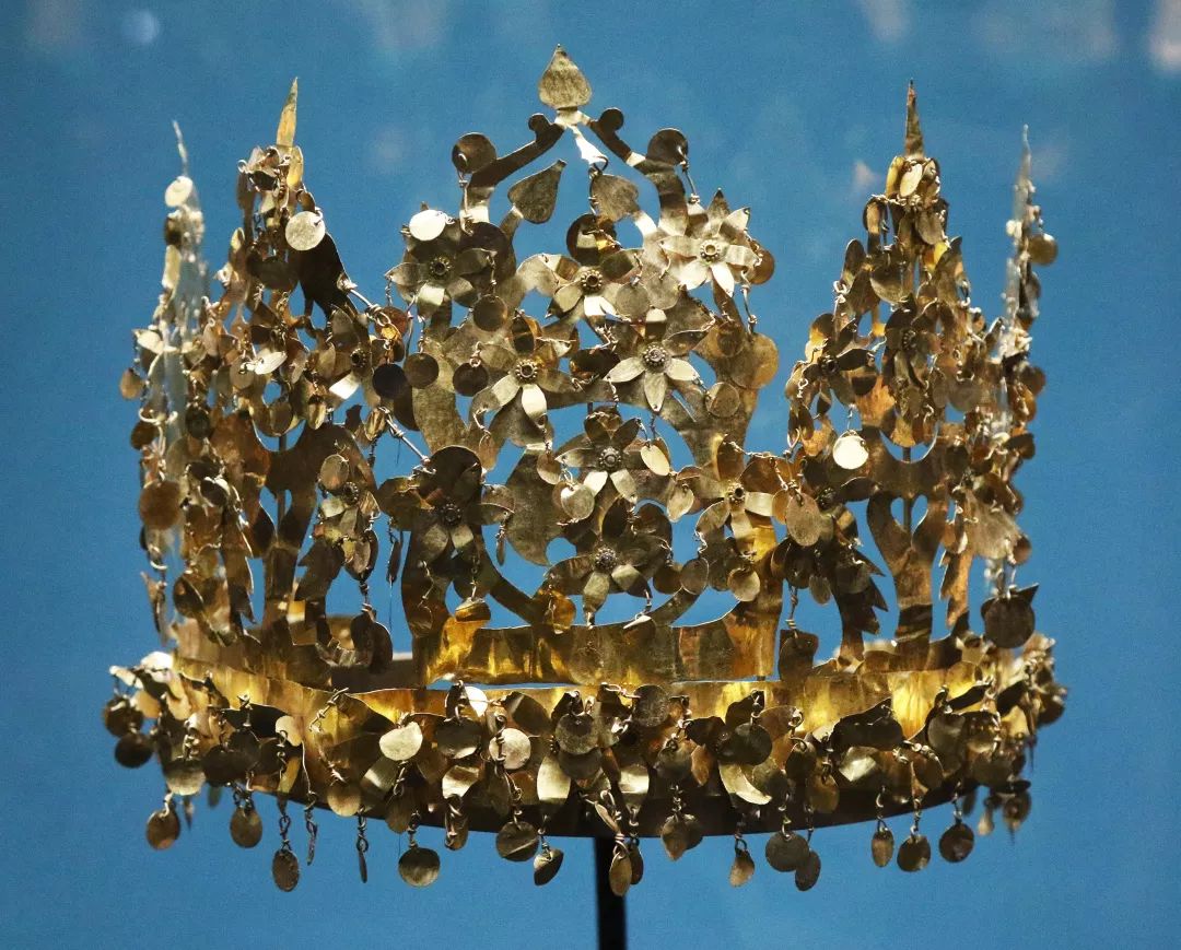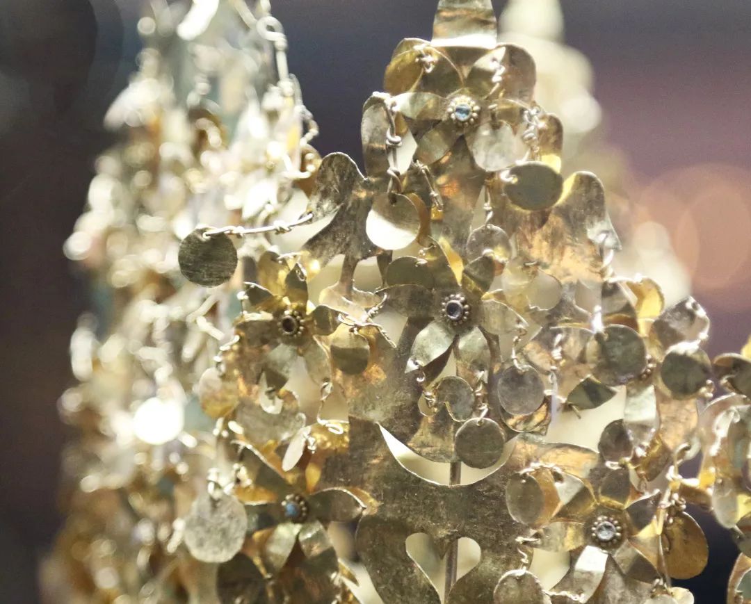 其中六號墓出土的黃金王冠是出土遺物中最精美而奪目的一件,王冠表面上百枚形狀各異的金制薄片如同樹葉一般掛在主體結構上,輕微的晃動都能產生搖曳的效果,金光閃閃、貴氣逼人。除王冠外隨葬品還有大量黃金飾品和冥器。黃金象徵的王權的高貴與不朽,與它們的主人一起長眠於地下。