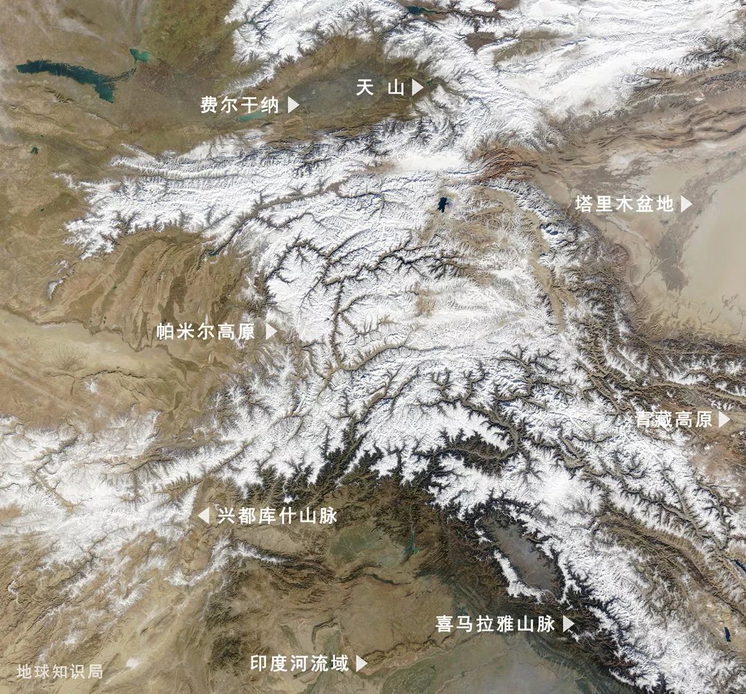 印度次大陸和亞歐大陸板塊碰撞,碰撞形成了巍峨高聳喜馬拉雅山脈、青藏高原、帕米爾山脈、興都庫什山脈。