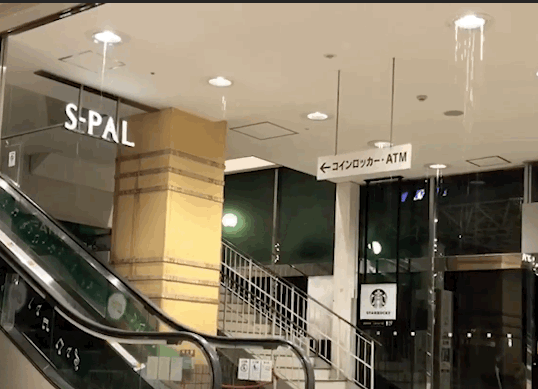 福島JR車站的天花板在地震後開始滲水。圖源:《朝日新聞》視頻截取