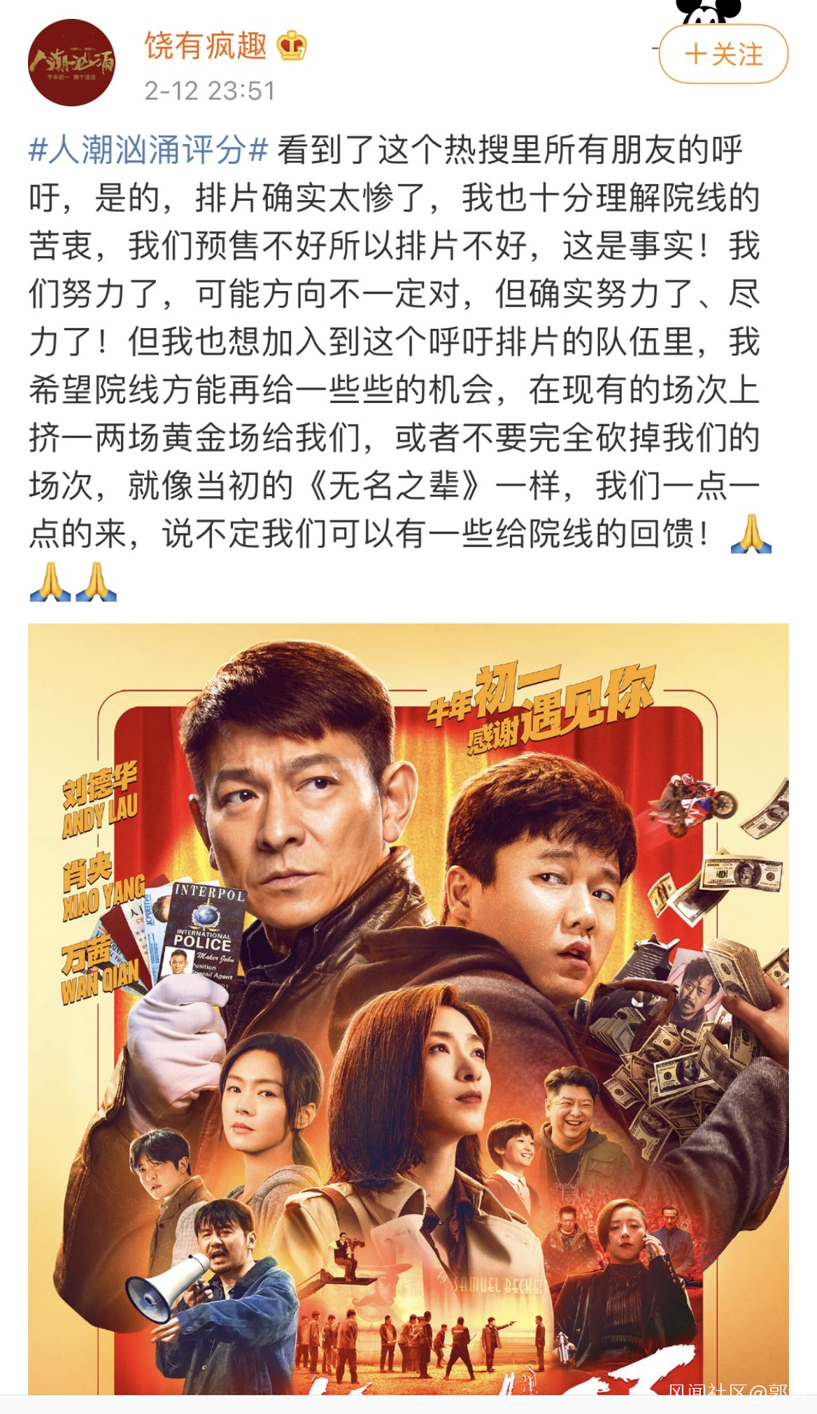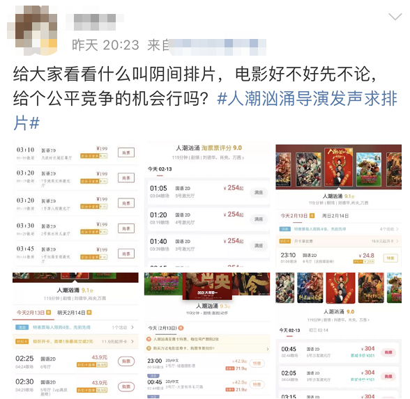 在口碑位居春節檔前列、排片卻遠遠落後的情況下,昨晚,電影《人潮洶湧》的導演饒曉志再次發聲“求”排片。