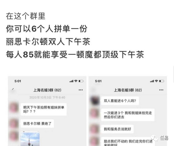 還有前段時間爆火的拼單名媛,姑娘們拼包包,拼首飾,拼寶格麗酒店,拼下午茶,不是同樣通過奢侈品和高端消費,在朋友圈裏偽造一個白富美的人設,用來抬自己的身價麼?