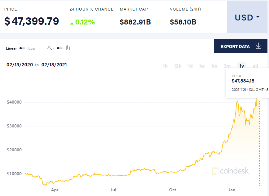 再來看看今年的幣價,這已經不能用魔幻來形容了,本以為比特幣漲過 4 萬已經是今年的極限了,可是隨着馬斯克的一波騷操作,不僅投資 15 億美金購買比特幣,甚至還支持比特幣購買特斯拉,直接將比特幣從頹勢拉至新高。