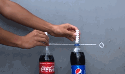 但味覺不好區分,不代表不能用其他方式分辨——比如可樂最普適的“玩法”,和曼妥思薄荷糖混合造成噴泉。可口和百事在與曼妥思薄荷糖的反應中確實存在一些差別,一般來説,百事的噴泉效果會稍猛一些,可以作為分辨兩種可樂的一種方法。