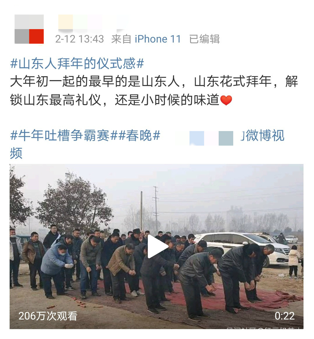 日前,多則山東人拜年的視頻走紅網絡。視頻中,清一色的男人或站在村道上,或站在家門前作揖、下跪磕頭,場面蔚為壯觀。視頻發佈者稱,“大年初一起的最早的是山東人……解鎖山東最高禮儀,還是小時候的味道”。