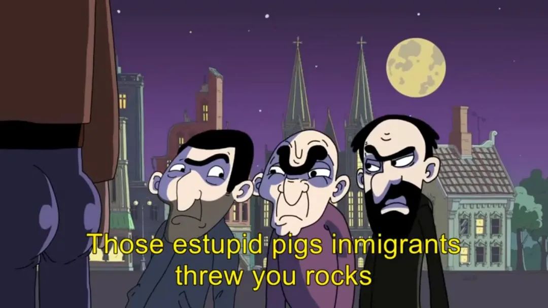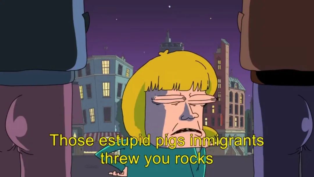 於是她轉而回頭指責難民:“這些像豬一樣蠢的移民們竟然向你們扔石頭!真是一羣心胸狹隘的豬!”