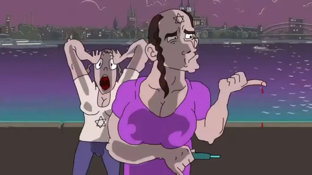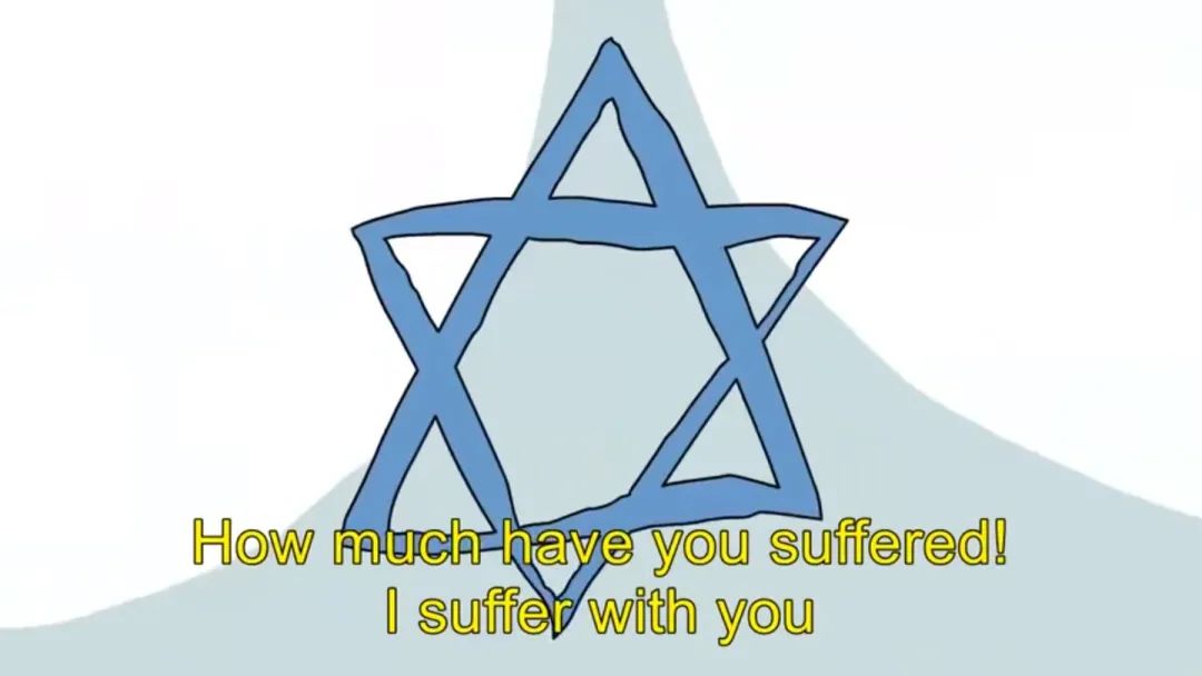 兩個被扔石頭的人,則脱了衣服,露出六芒星。(猶太人的標誌)。
