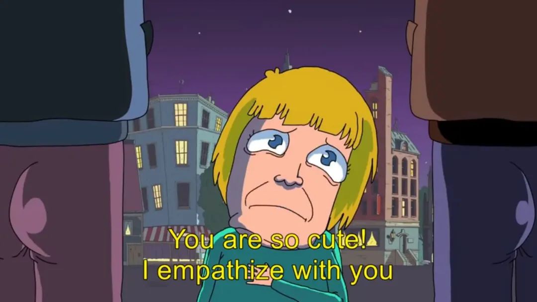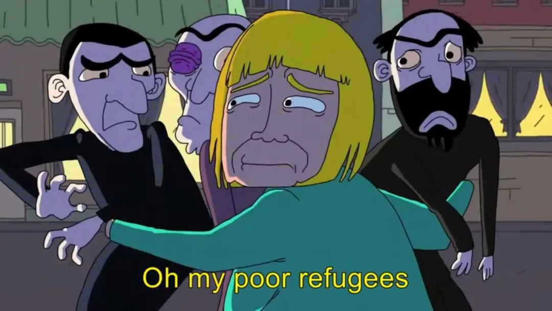 結果一個長得很像默克爾的女人跳出來説:“我可憐的難民!”