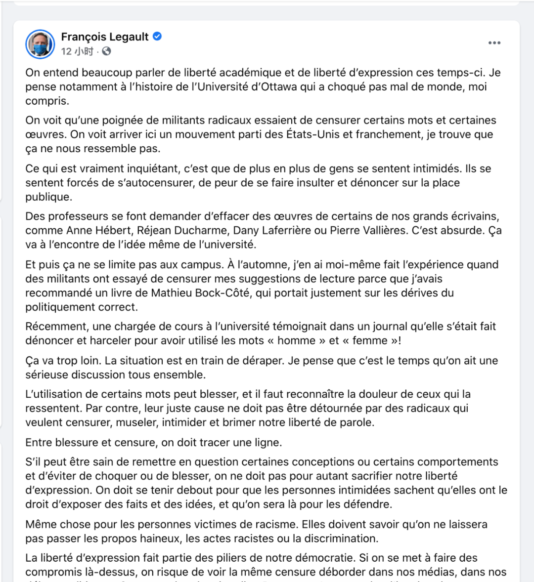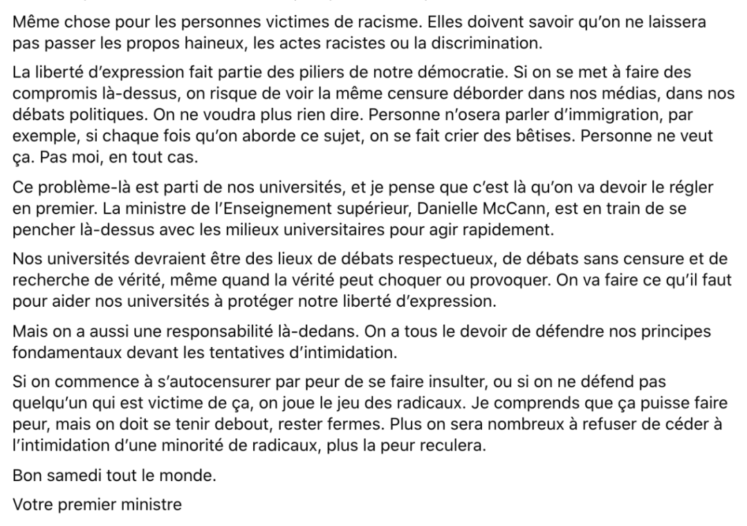加拿大魁北克省省長François Legault,最近在FB上發了一封長信,如果你懂法語,可以看看下面的原文。