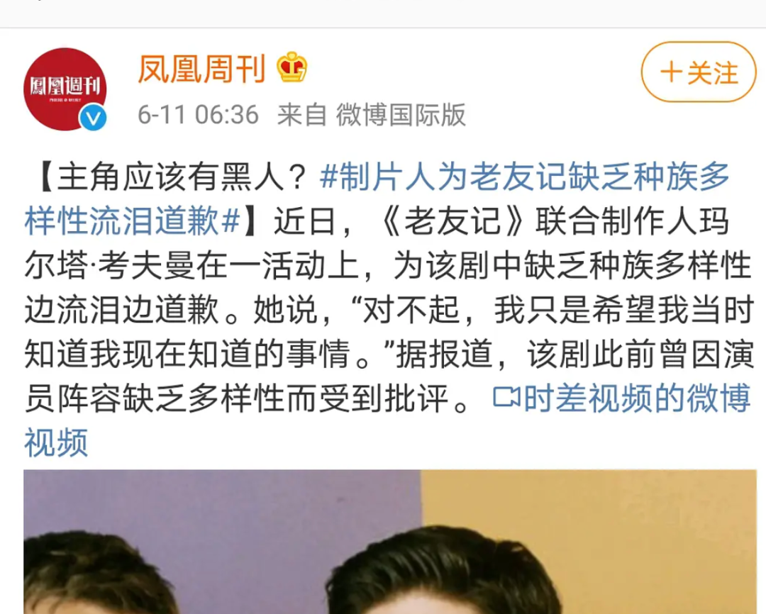 與此同時,《老友記》製片人為自己的作品主演都是白人,沒能充分體現“種族多樣性”,流着淚向公眾道歉。
