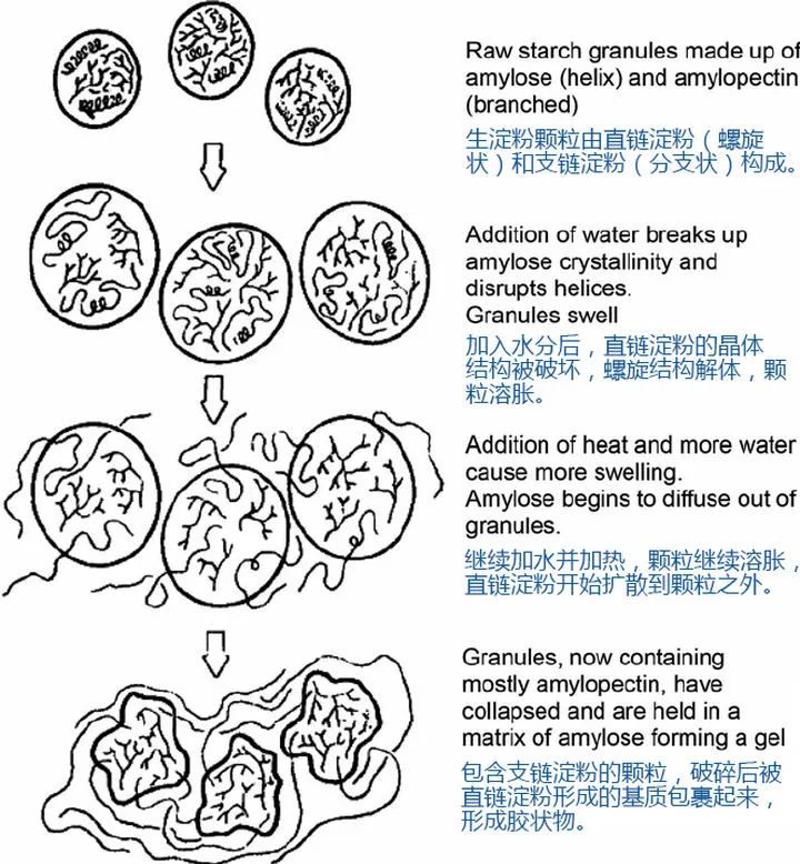 澱粉顆粒與水接觸之後,就會膨脹變大,澱粉顆粒中直鏈澱粉的螺旋結構解體,而支鏈澱粉的結構則比較穩定。