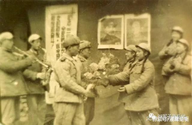 1952年春,到部隊演出,部隊開慶功會,為英雄獻花。前面是楊昭彩,後面是張文一。