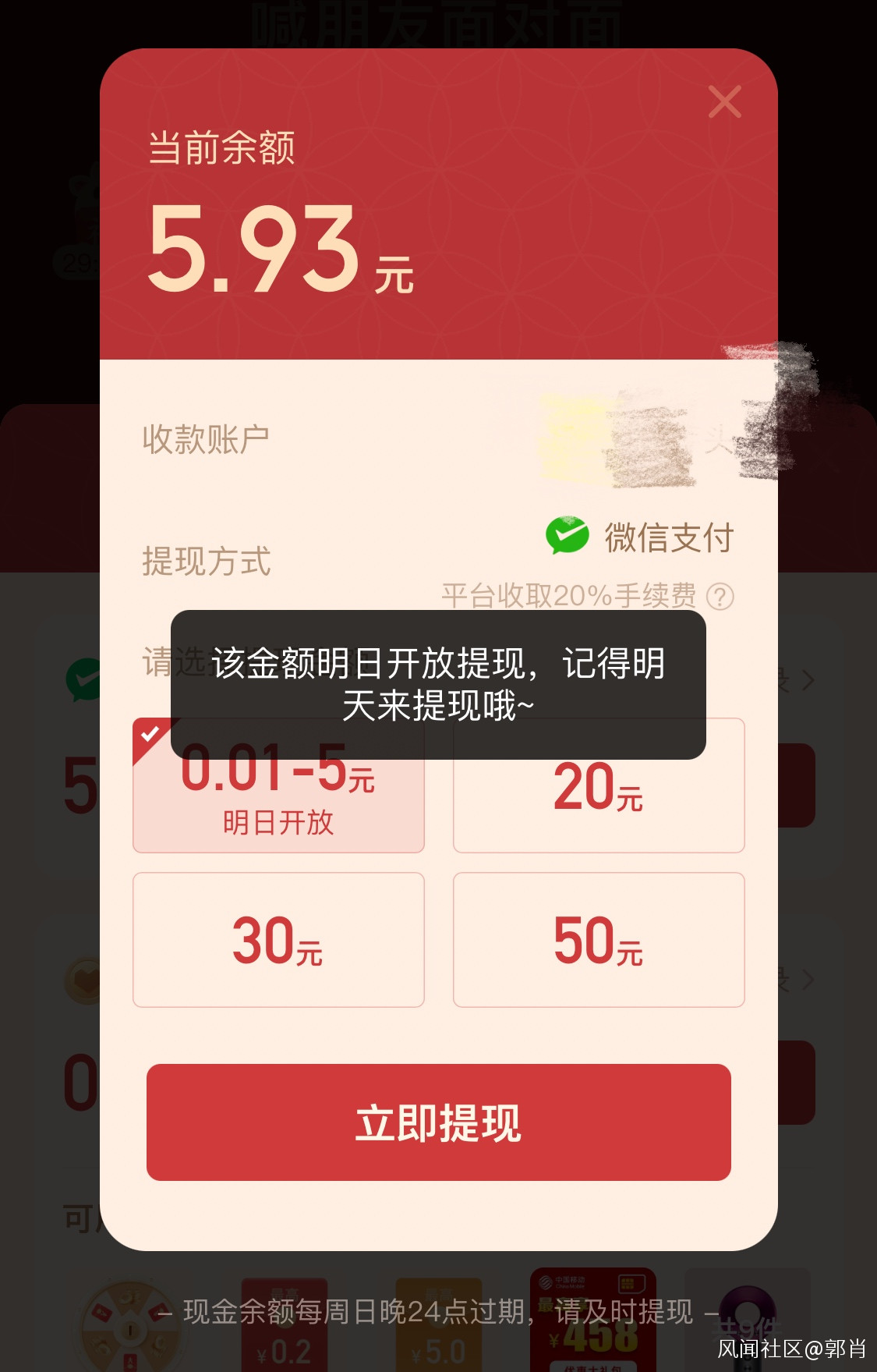 其提現門檻有4個等級,記者在2月13日中午看到,“提現0.01至5元”的選項已被堵死,顯示為“明日開放”。