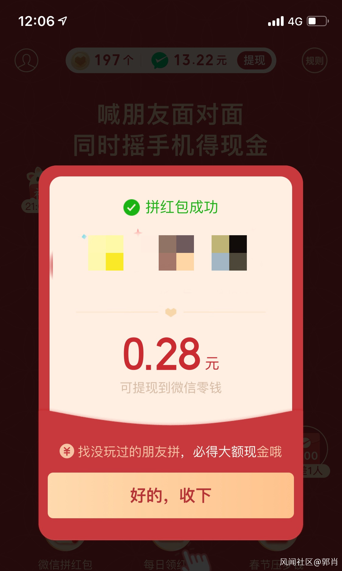 和拼多多過往的活動類似,要想獲得拼多多的紅包,還是得靠找朋友助力幫忙,比如“喊朋友面對面同時搖手機”、“和微信好友拼紅包”。