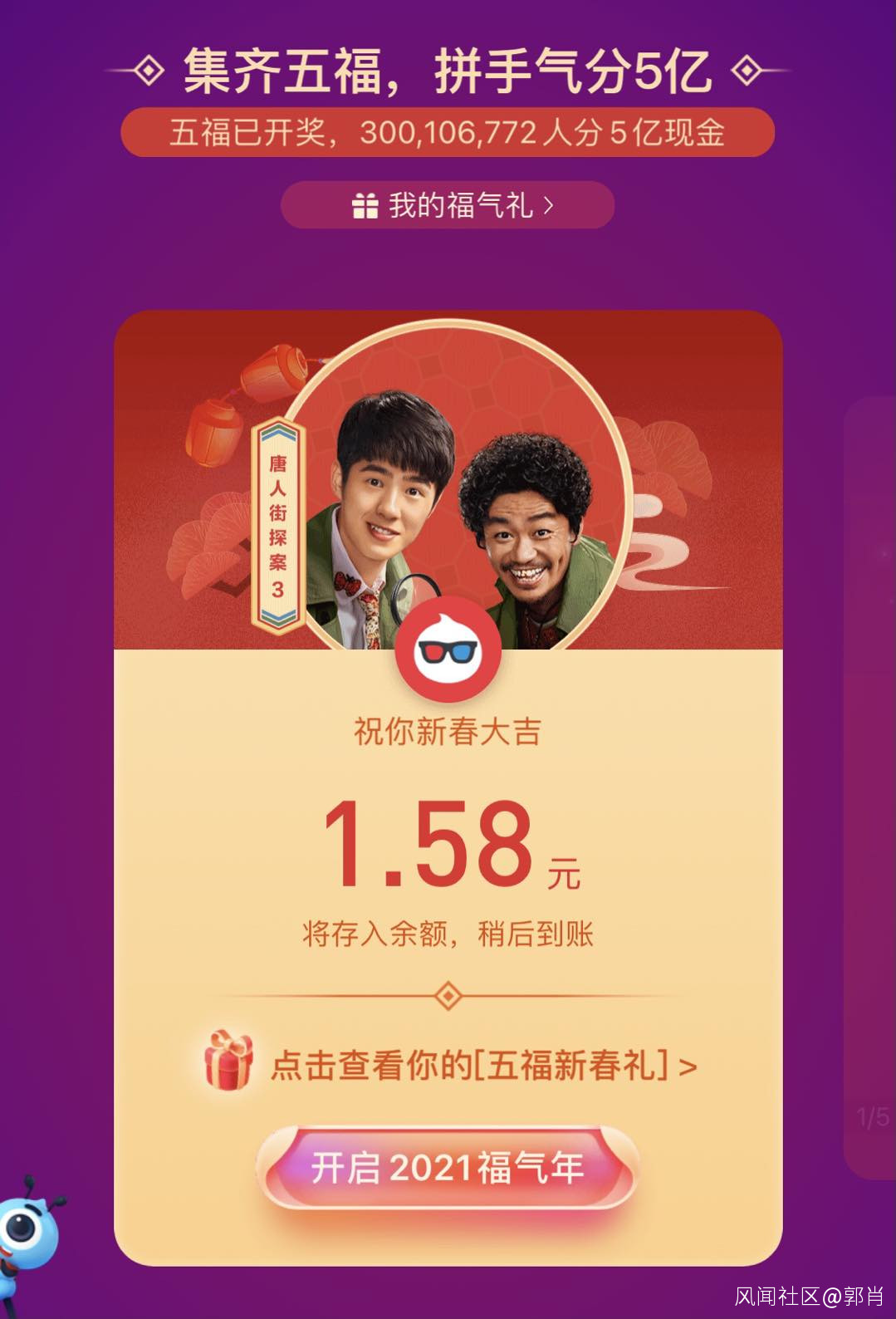 2月11日,大年三十晚10點18分,2021年度支付寶“集五福”活動正式開獎,有3億人蔘與分5億現金。支付寶方面介紹,作為新年俗,六年累計參與集五福的人數已經超過了7億,每2箇中國人裏就有1個曾掃福、集福、送福。