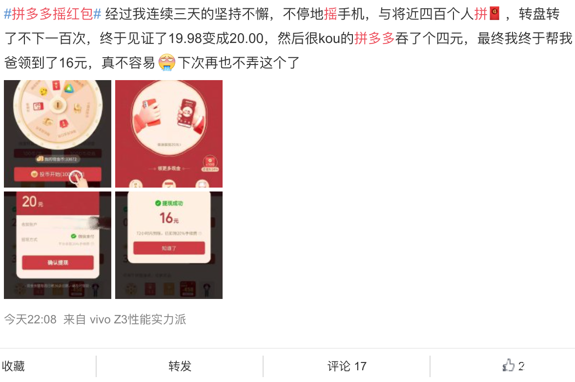 微博上也有其他用户表示提現成功,一位微博網友寫道:“經過我連續三天的堅持不懈,不停地搖手機,與將近四百個人拼,拼多多吞了個四元,最終我終於幫我爸領到了16元,真不容易。”