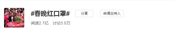 截至發稿,微博話題 #春晚紅口罩# 閲讀量達到2.7億次,討論次數達到5.8萬。