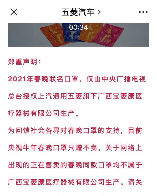 2月14日,上汽通用五菱再次發佈聲明稱,2021年春晚聯名口罩,僅由中央廣播電視總枱授權上汽通用五菱旗下廣西寶菱康醫療器械有限公司生產。