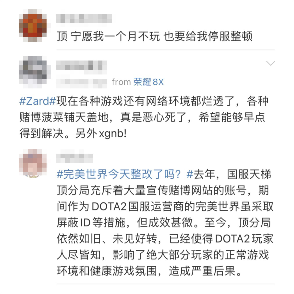 “就算是代理我也不相信封個賭博賬號能有多難,不作為=縱容=有責任。”@鄭翔Zard- 在博文中質疑完美世界“不作為”。