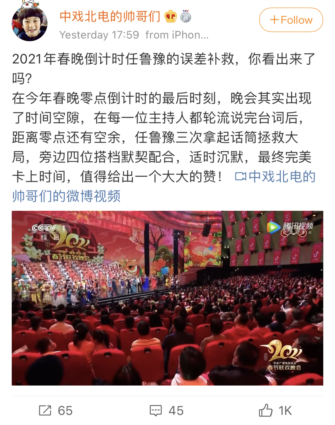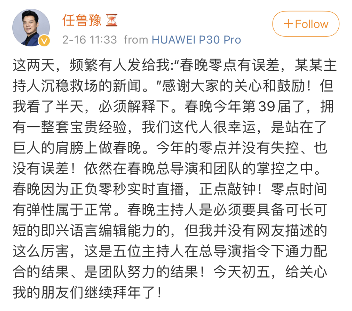 他繼續解釋稱,“今年的零點並沒有失控、也沒有誤差!依然在春晚總導演和團隊的掌控之中。春晚因為正負零秒實時直播,正點敲鐘!零點時間有彈性屬於正常。”