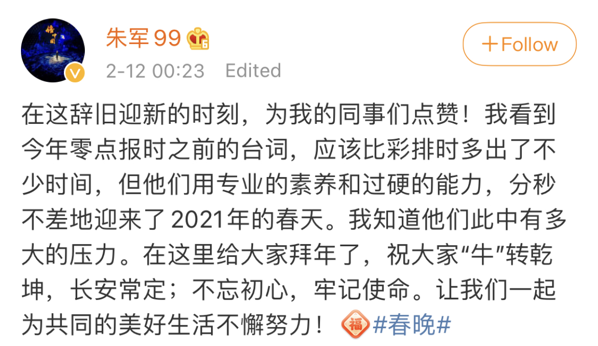 12日凌晨,曾經的“春晚一哥”朱軍率先發文稱讚了後輩們的表現,稱“我看到今年零點報時之前的台詞,應該比彩排時多出了不少時間,但他們用專業的素養和過硬的能力,分秒不差地迎來了2021年的春天”。