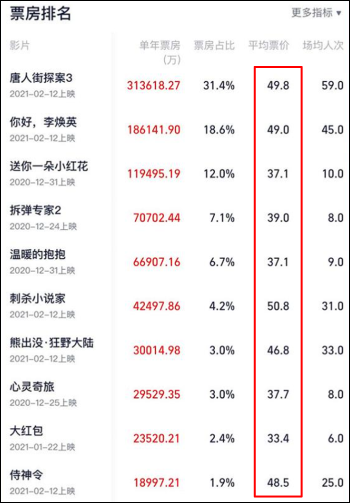 此外,燈塔實時數據截至2月16日上午9時30分的統計顯示,2021年春節檔單部電影的平均票價在37.1-49.8元不等,均未超過50元。