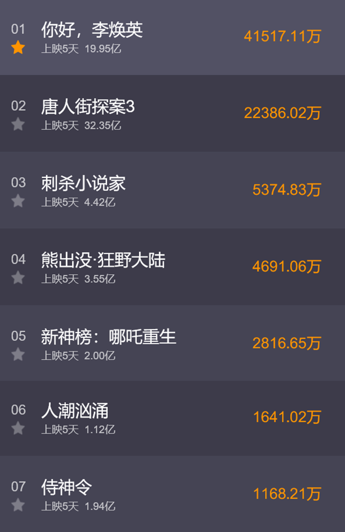而截止2月16日下午15時20分,2021年的7部春節檔電影中,《你好,李煥英》有8.3分,其它電影大多在7分以上,評分最低的《唐人街探案3》也有5.7分。