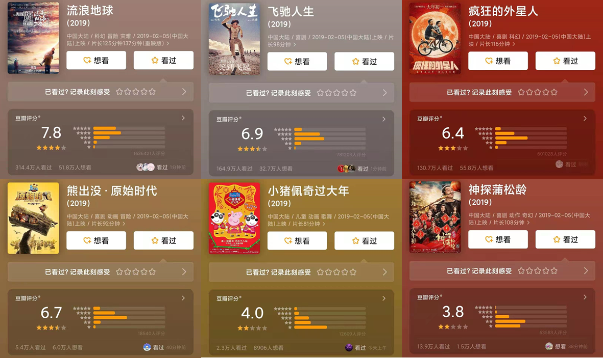 豆瓣電影顯示,2019年的《流浪地球》《飛馳人生》《神探蒲松齡》等6部電影口碑差距較大,最高的《流浪地球》有7.8分,而最低的《神探蒲松齡》則只有3.8分,其它電影也在6分上下。