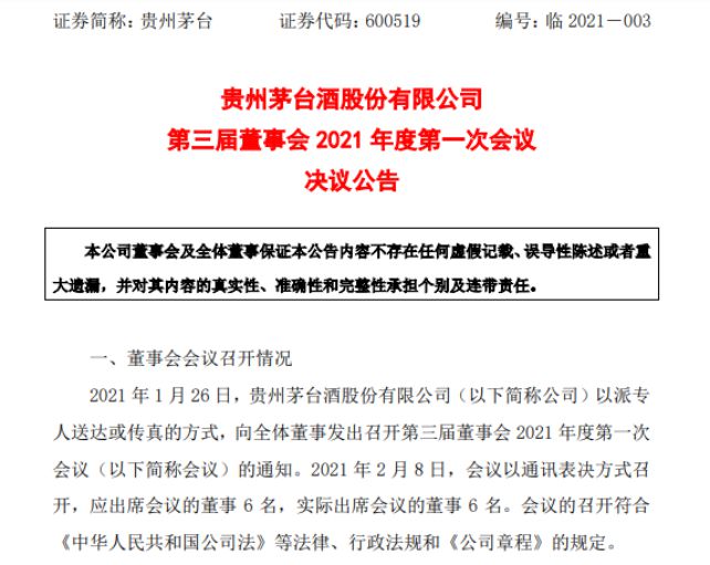2月9日晚,貴州茅台發佈《貴州茅台酒股份有限公司第三屆董事會2021年度第一次會議決議公告》,共計全票通過八個議案。