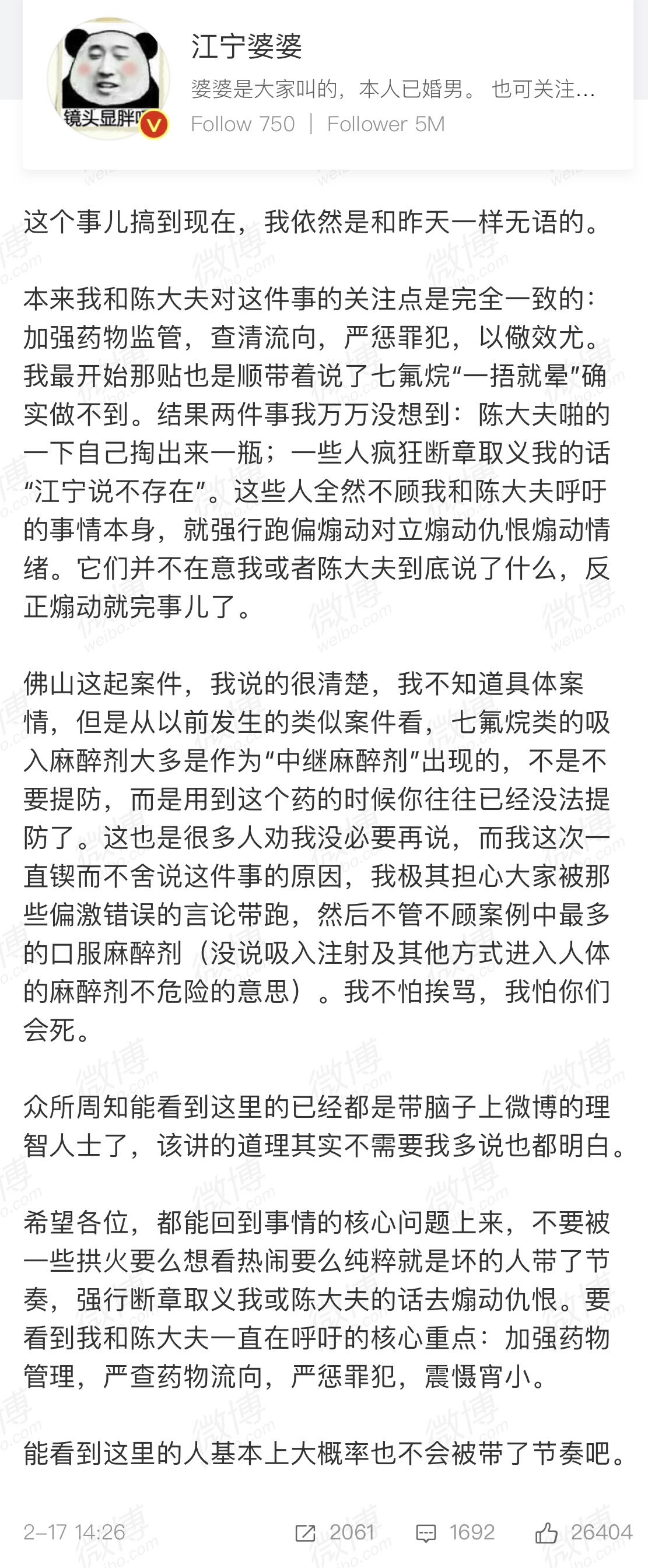 隨後,她還轉發了@江寧婆婆 的微博,寫道“同意”。在該篇微博中,@江寧婆婆 強調,他和陳大夫對這件事的關注點是完全一致的:加強藥物監管,查清流向,嚴懲罪犯,以儆效尤。