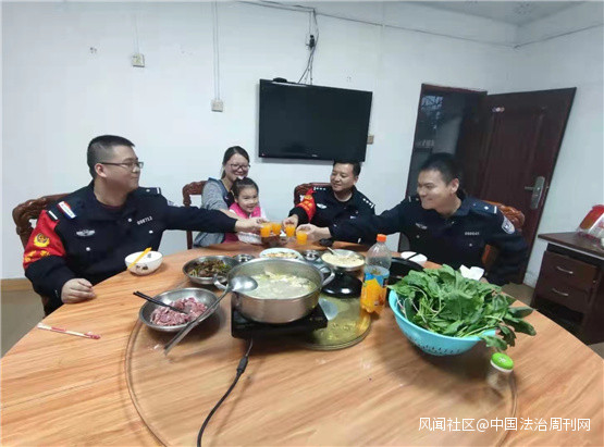 然而除夕的下午,當李所如往常一樣帶領民警開展消防隱患排查工作回來時,發現所裏多了兩位“不速之客”——李所的妻子和女兒。“爸爸,你不回家過年,那我們過來就來陪你過年啦”,面對着飛撲過來抱住自己的女兒,和站在不遠處的妻子,李所除了愧疚便是感動。我們的警嫂看着李所熱淚盈眶的臉龐打趣道:“可不是我想來的,是你家女兒硬拉着我過來的”,民警們也紛紛開玩笑道:“有嫂子在,不用擔心今年的年夜飯了”。