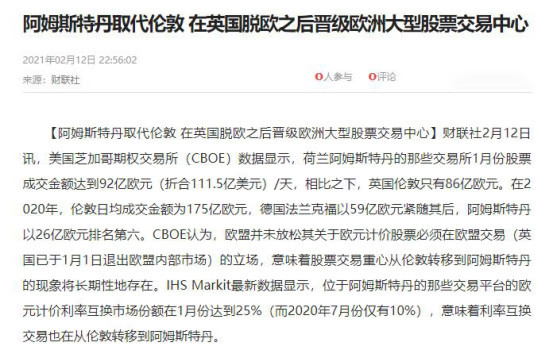 金融市場公司CboeEurope的數據顯示,今年1月,阿姆斯特丹證券交易所的每日交易量為92億歐元,大大超過倫敦的86億歐元。
