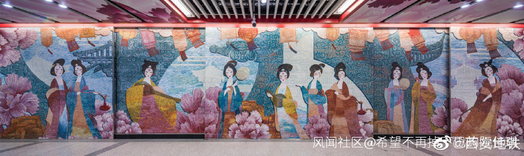 大雁塔站《雁塔秀色》,通過雁翔高飛、雁塔禪院、芙蓉園景等文化元素,描繪以大雁塔為核心的唐文化風景區;
