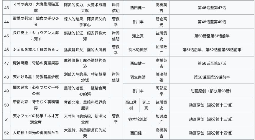 動畫版《中華小當家》前期捨棄了改編漫畫第7-14話描述小當家在陽泉酒家成長的內容,但在最後四集原創劇情中,又採用了漫畫7-14話中的一些元素,如料理鳳凰水晶等(圖源維基百科)