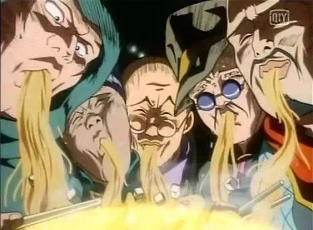 **另外一種重要的原創特效,就是料理完成後的試吃環節中,試吃員的顏藝表現和內心獨白。**原作中短短几格的顏藝表現,在動畫中被拓展為一段長達幾分鐘的心理景象:切換各色美好的自然圖景、夢中圖景以及最終出現的審判詞——“美味”兩個大字。搭配上激情的台詞,場面可以説是華麗誇張得近乎鬼畜,但觀感又十分具有衝擊性。