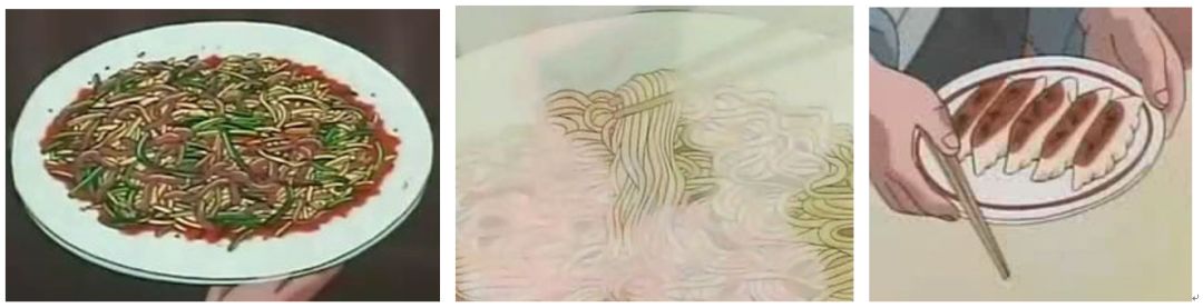 動畫中登場料理:從上至下分別為青椒肉絲,國士無雙面,煎餃