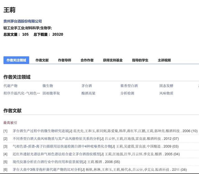 據中國知網公開數據顯示,王莉總計發表包括《茅台酒生產過程中的微生物研究進展》《醬香型白酒釀造微生物代謝產平台的研究進展》《“十一五”期間茅台集團白酒風味物質研究平台建設及應用回顧》等論文105篇,研究方向包括:“茅台酒”“醬香型白酒”“釀酒高粱”等,總下載量達20320次,最高引用量為77次。