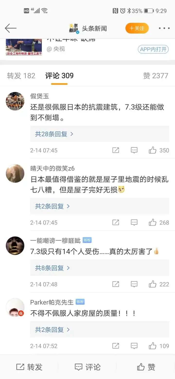 日本每次地震,微博最多的評論是:“你看人家日本房子,7.3級地震都沒事,工匠精神,恐怖如斯……”
