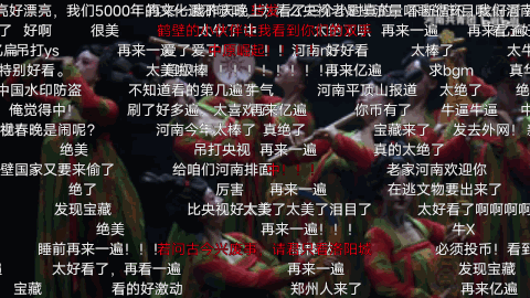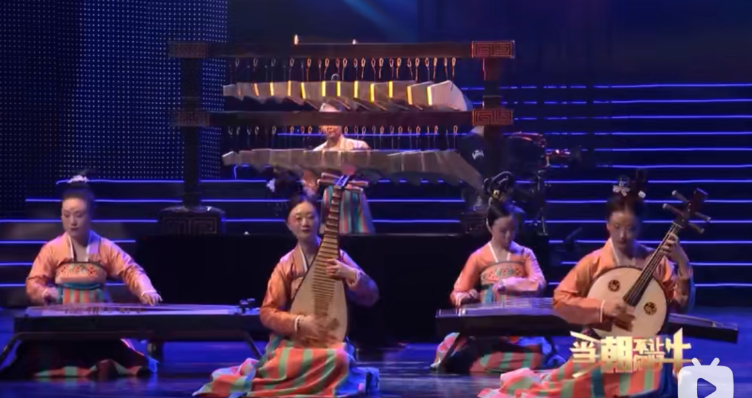 目前火出了圈的就是河南春晚中的舞蹈節目《唐宮夜宴》,古典舞《唐宮夜宴》以夜宴的樂師們為主角,展示了唐朝少女們,從準備、整理妝容到夜宴演奏的過程,整個舞蹈中還穿插了插婦好鴞尊、蓮鶴方壺 、賈湖骨笛 、簪花仕女圖等國寶場景。