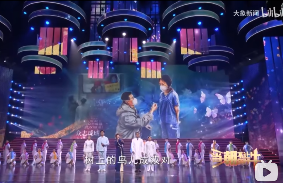又如戲曲串燒中的《天仙配》,説的是疫情期間的愛情,只有這樣普通人樸素、真誠而又熱烈的愛情,沒有催婚,沒有煽動焦慮,才會讓普通人嚮往愛情,這才是真正的“樹上的鳥兒成雙對”。