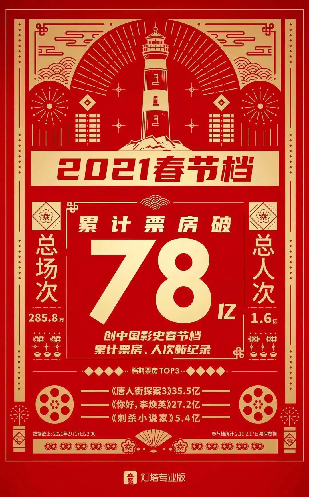 這也是為什麼在疫情防控的種種限制中,今年春節檔還能頻頻刷新票房紀錄。從除夕夜預售破14億,追平2019年水平;到首日狂攬17億,刷新2019年14.43億票房紀錄;同時《唐探3》首日單片票房破10億,翻倍刷新《捉妖記2》和《復仇者聯盟4》保持的5.5億首日紀錄;截至2月18日零時,春節檔7天總票房突破78億,已經穩超2019年的65億。