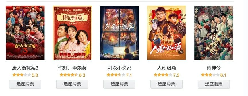 在可達滿場的5部片中,影院又使出價格戰來試探哪部片的需求更大,觀眾願意花高價買,就給哪部更多的排片。某影院經理告訴硬糖君,《唐探3》最能拉高價格,相當於排一場《唐探3》抵其他片排兩場的收入。這也從側面説明,春節檔前兩天《唐探3》需求量大到其他片望塵莫及。