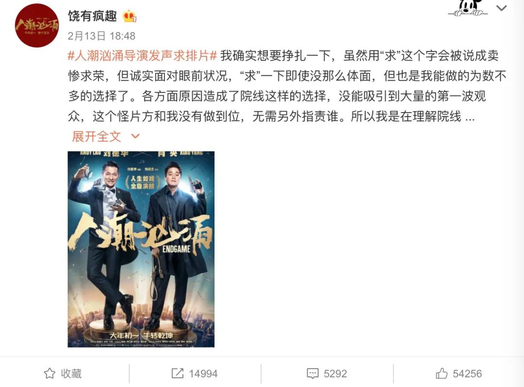 大年初二,《人潮洶湧》導演饒曉志開始在各路社交媒體上發聲求排片,稱自己已經盡最大努力,迫不得已“求”影院多一些排片。他將《人潮洶湧》與他上一部黑馬片《無名之輩》作比,希望給《人潮洶湧》一點時間發酵、逆襲。