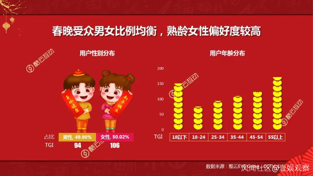 與此同時,酷雲互動數據顯示,2020春晚同比關注度較2019年有了小幅下滑,用户年齡分佈排在前兩位的分別為55歲以上和18歲以下羣體。
