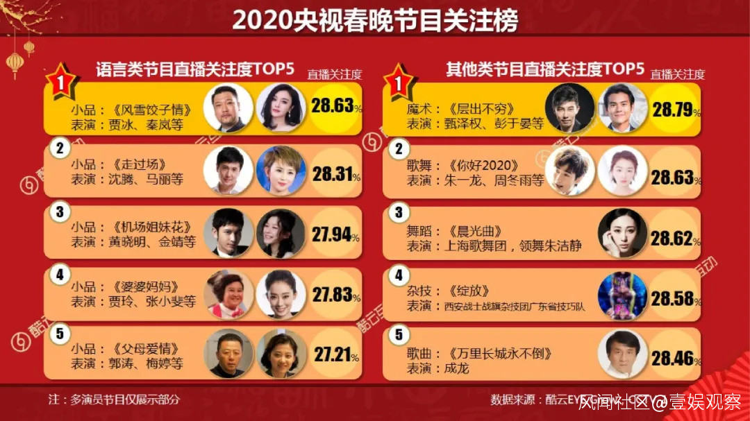 除了社交平台的討論,流量、大熱明星的效果還反映在節目的熱度、收視情況上。有數據顯示,2019年,春晚收視率最高的節目為《我們都是追夢人》,參與表演的有TFboys、秦嵐、景甜、江疏影和吳磊等。根據酷雲互動數據顯示,2020春晚的直播關注度基本保持平穩,但整場晚會關注的最高點為魔術《層出不窮》,嘉賓為甄澤權、吳磊、彭于晏、彭昱暢。