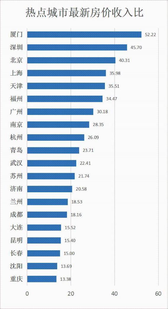 張薔的這筆賬非常直觀地反映出了新一線城市與一線城市相比比較明顯的“機會成本”優勢。根據NUMBEO的最新數據顯示,20個熱點城市中,深圳、北京、上海的房價收入比分別高達45.70、40.31和35.98,排名均進入了前五。重慶、瀋陽、成都等新一城城市房價收入比分別低至13.38、13.69、18.16。從這個角度理解,一些新一線城市安家立業的機會成本不足北上深的一半甚至更低。