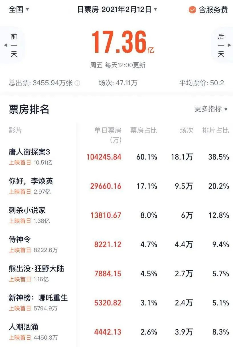 其中《唐探3》首日豪取10.51億元票房,佔比總票房60.1%,放映場次高達18.1萬場,觀影人次也達到1945.2萬人次,佔比60%,坐實檔期冠軍寶座之餘,上演打破多箇中國影史的“紀錄秀”。