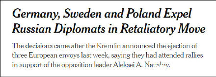**俄羅斯與西方國家之間的新一輪外交風波愈演愈烈。**俄羅斯與歐盟國家(瑞典,波蘭和德國)互相驅逐外交官事件,從2月5日起開始沸騰,幾天之內,各國外交部接連“互相驅逐”。