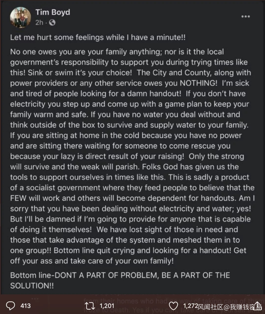 你問我沒有水,沒有電,我會不會感到很抱歉?是的,我會。但是,我要是去幫助他們能夠自救的人,我會遭到天譴的。我們已經受夠了那些佔政府系統便宜的人。底線就是別哭哭啼啼了,也不要伸手要施捨了。滾他媽的一邊去,照顧好你的家人。底線——不要成為問題的一部分,要成為解決方案的一部分。” 😱😱