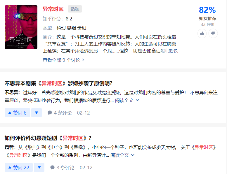 儘管影響力沒有付費或免費閲讀平台那麼高,但知乎確實生長出了一批富有網感、相對精良,且體量有別於傳統網文的小説作品。而就已知信息看,知乎所投入的劇集並不是門檻低、受眾廣的喜劇或甜寵,而更多是懸疑、科幻、腦洞驚悚類型,包括春節期間已經偷偷上架了一部由《不思異》系列團隊兔猻文化打造的《異常時區》,反響不大但評價似乎不錯。