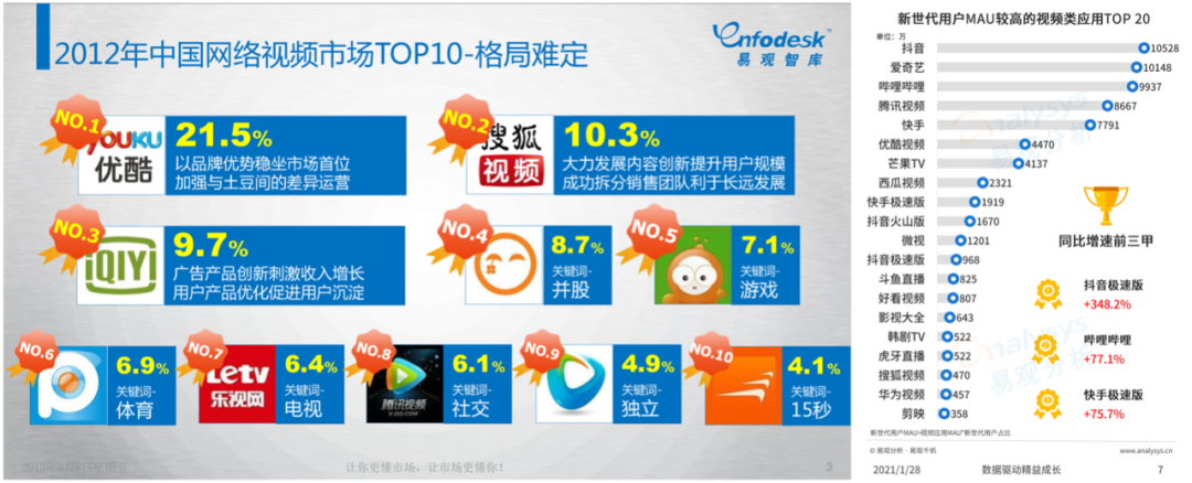 左圖出自易觀《2012年網絡視頻市場年度盤點》,右圖出自易觀《2020年中國新世代用户視頻消費行為洞察》
